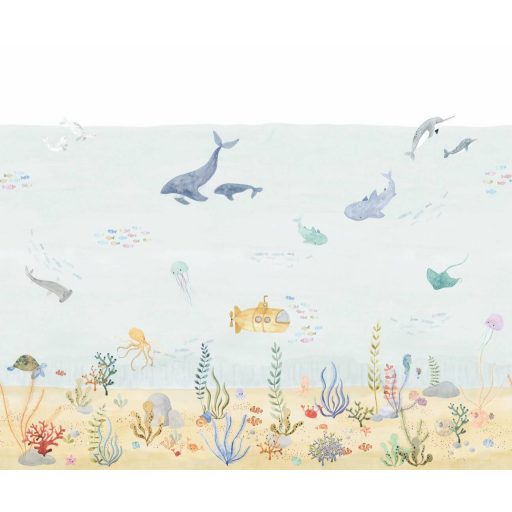 Bálnákat, delfineket, cápákat, tengeralattjárókat és növényeket ábrázol, amelyek