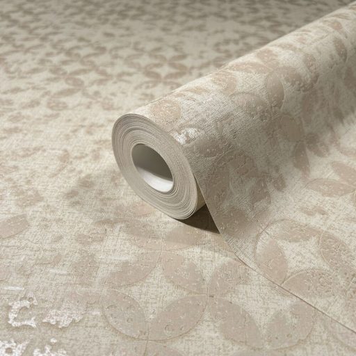 Stilizált levelek strukturált koptatott felületen grafikai minta bézs és gyöngyház fémes hatás tapéta