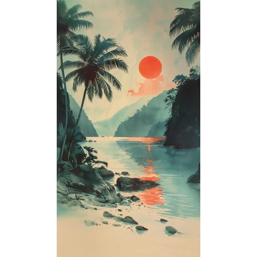 Mintázat : Trópusi öböl a vöröslő nap fényében kies és keleties panoráma