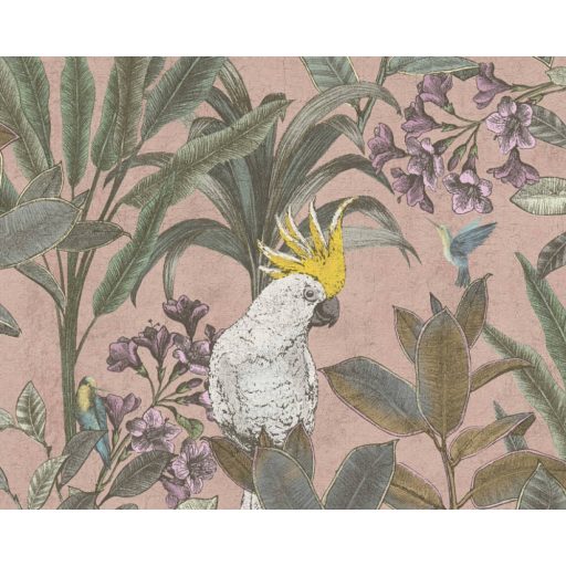 Trópusi virág és levélmotívum békés kakadukkal Shabby megjelenésben ó-rózsaszín bézs zöld barna sárga fehér és lila tónus tapéta
