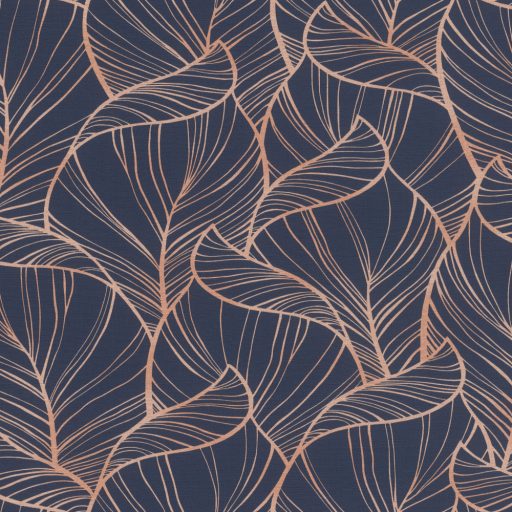 Túlméretezett grafikus levélzet/lombozat minta textil háttéren éjkék és bronzszín tónus fémes csillogású mintarajzolat tapéta