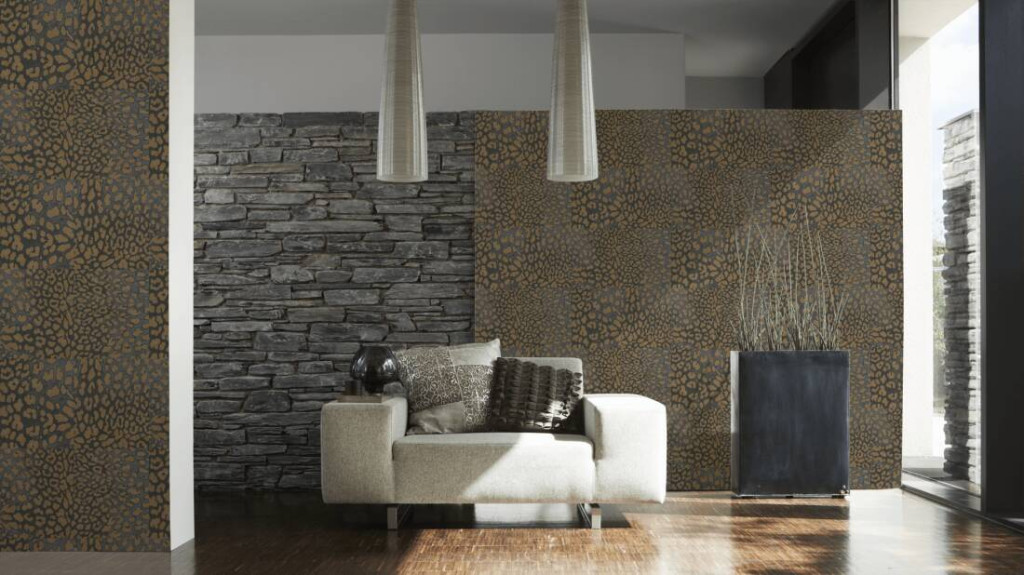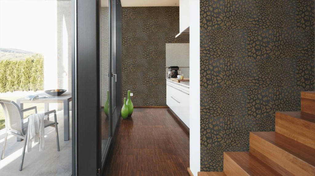 Vadító leopárdbőr minta négyzetekbe rendezve sötétbarna/antracit és aranybarna tónus finom fény tapéta