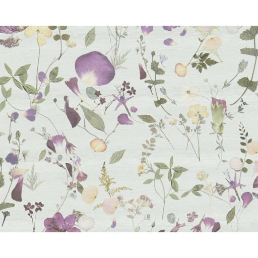 Vadvirágok impulzív és változatos kompozíciója világoszöld sárga zöld és lila tónus tapéta