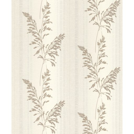 Változatos csíkos háttéren zsenge hajtások levélmintázat törtfehér világosszürke fényes bézs tapéta
