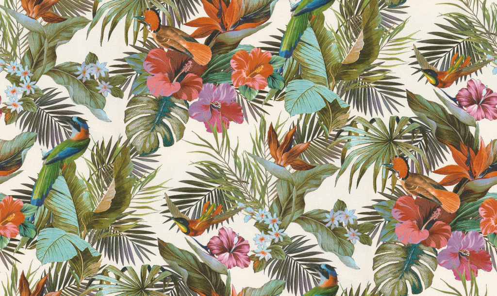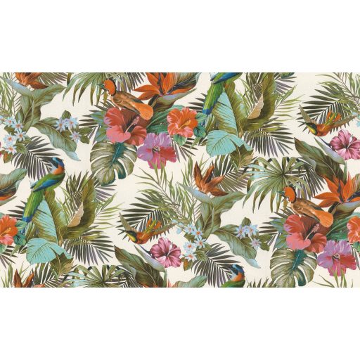 Mintázat : Vibráló hibiszkusz smaragdzöld pálmalavelek és kolibrik éneke