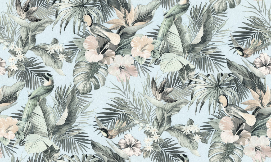 a szürkészöld pálmaleveleket a légies kék alapon, mintha egy haute couture