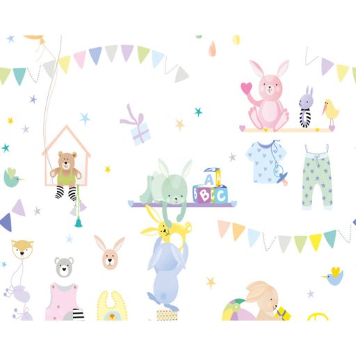 Vidám állatsereglet játékos hangulatban fehér kék rózsaszín szines falpanel