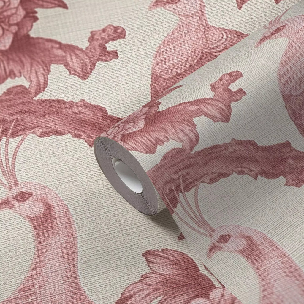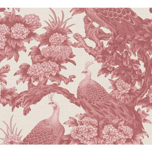 rózsaszínes-vörös (vagy mályvaszín) árnyalatban, fehér alapon. A minta pávákból
