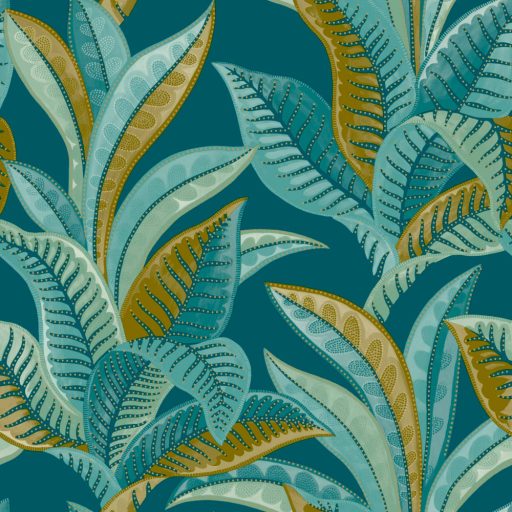 Színvilág : éjkék vízkék és zöld tónus fémes arany pöttyök a leveleken