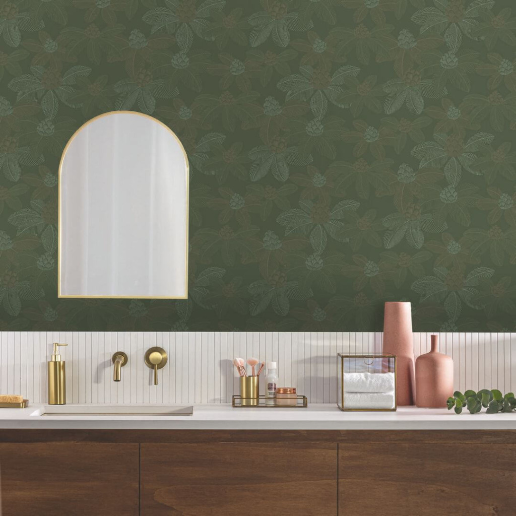 levelek és virágok luxust és harmóniát sugároznak. Modern fürdőszobában