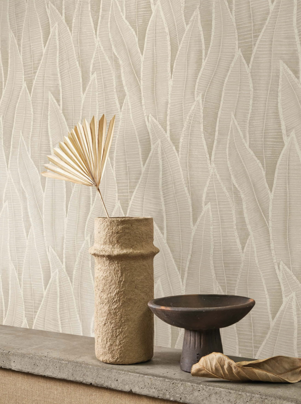 szőtt textilen. A minta légies mégis strukturált, mint egy szélcsendben álló levélfüggöny.