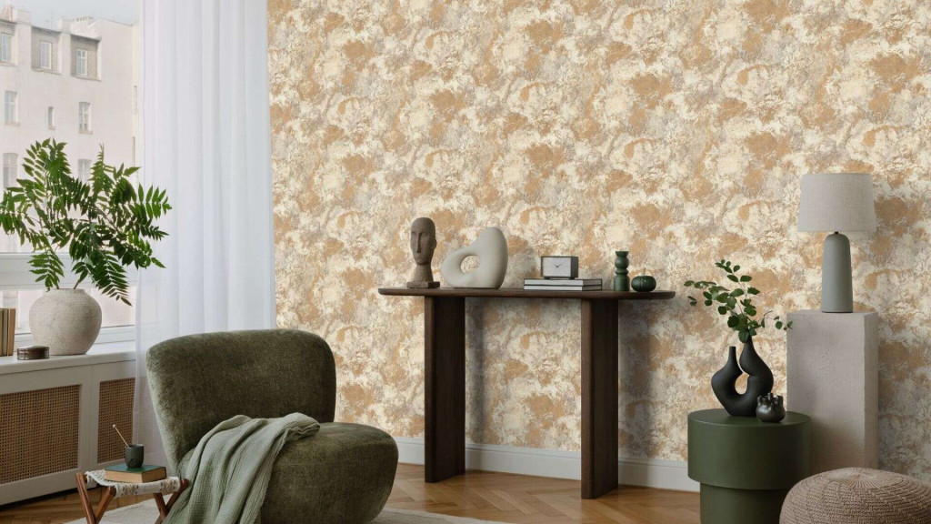Meleg okker, homokos arany és krémfehér foltok keverednek ezüstszürke árnyékokkal