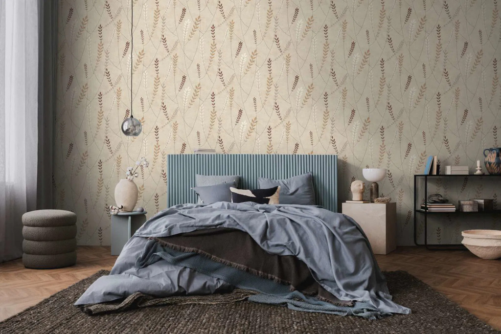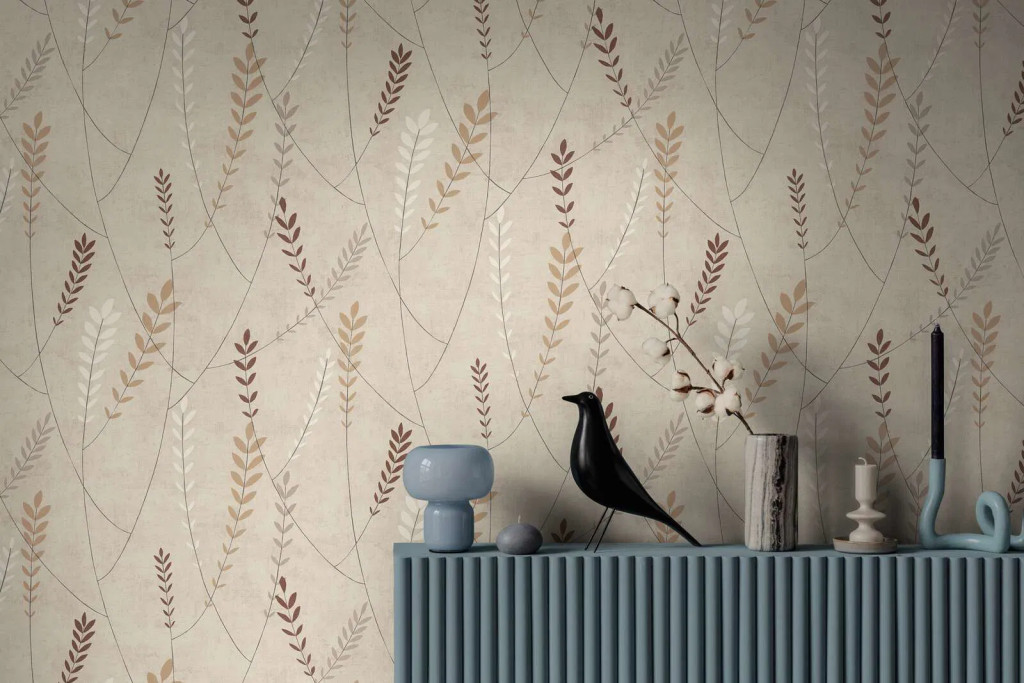 levélmotívumok táncolnak a krémszínű alapon, mintha az szi szél simogatná őket.