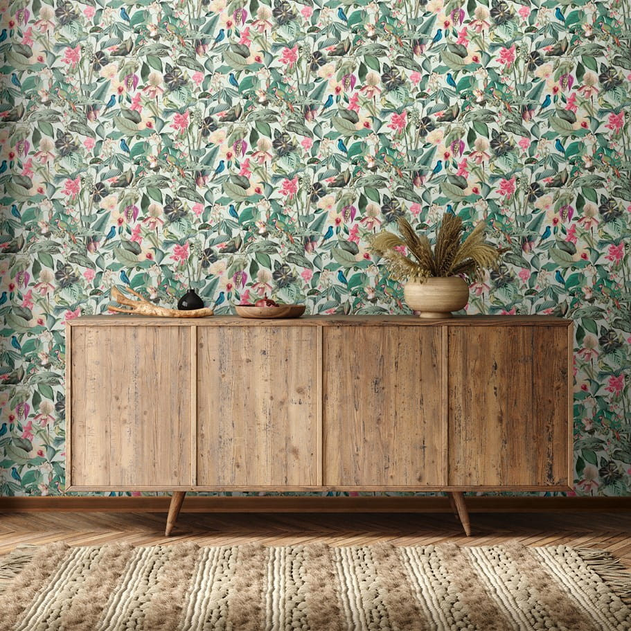 Smaragdzöld levelek, rózsaszín orchideák és türkiz madarak gazdag