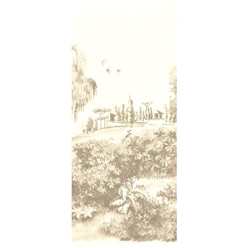 idilli tájat ábrázol. A fák pompásan nőnek a falon és csodálatos madarak