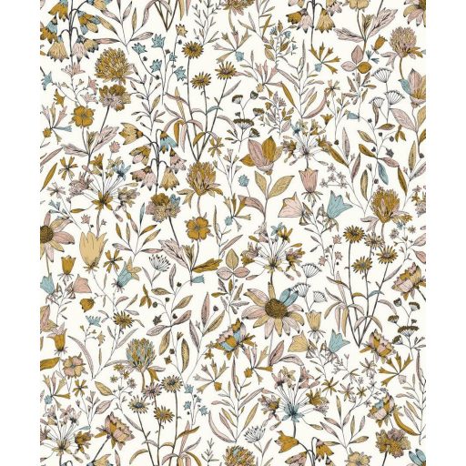 és mezei virágok színvilága pasztell türkiz, mustársárga és halvány rózsaszín