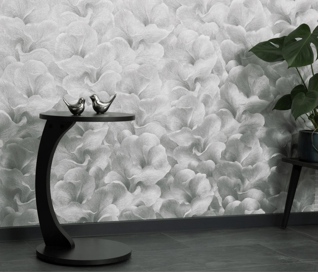 tónusban ragyog. A stilizált, egymásba simuló szirmok finom grafitszürke kontúrral
