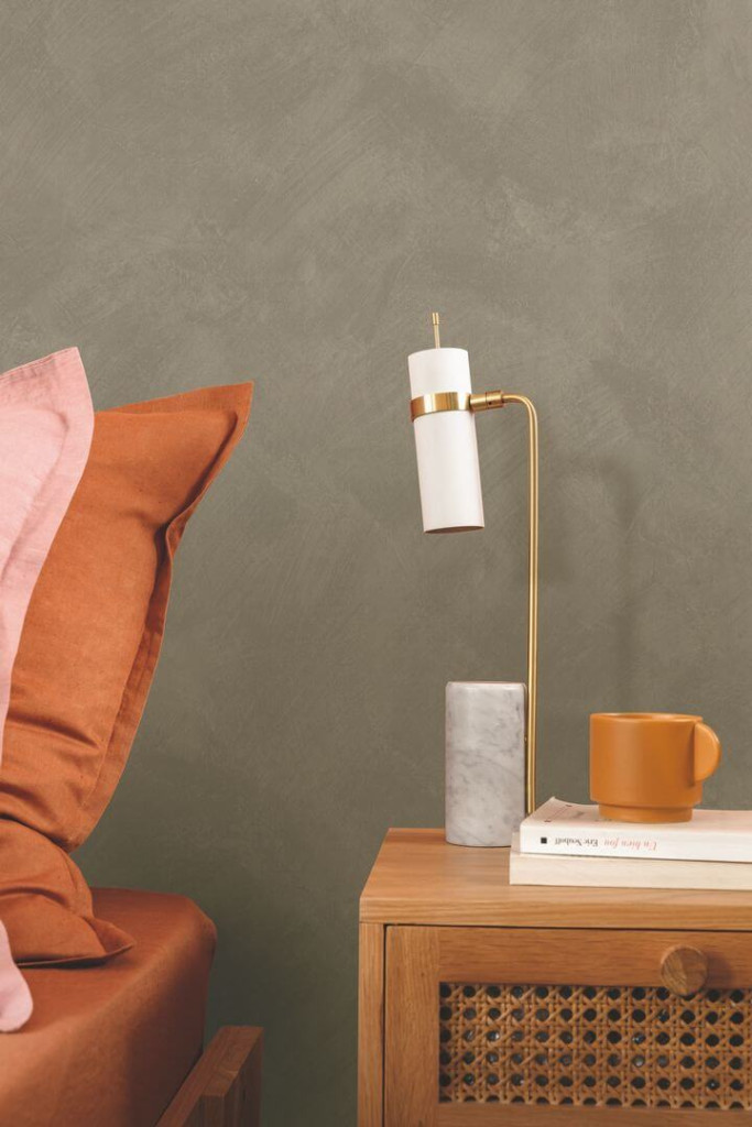 Hálószobában terrakotta és púderrózsaszín párnákkal meleg kontrasztot