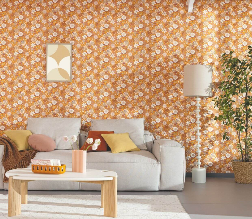 hetvenes évek bohém báját. A mély narancs háttér vibrál miközben a