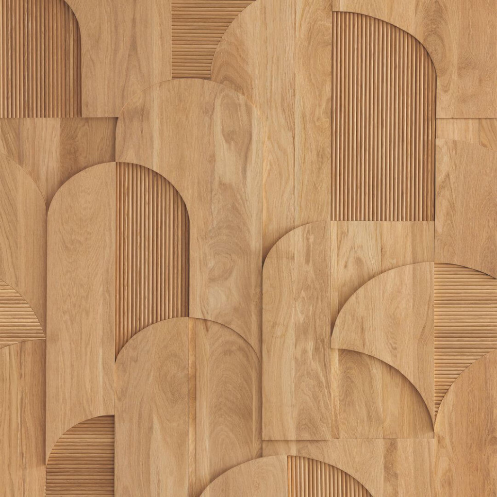 keresztül néznénk egy faragott falpanelt, ahol minden ív, barázda és textúra a kézműves