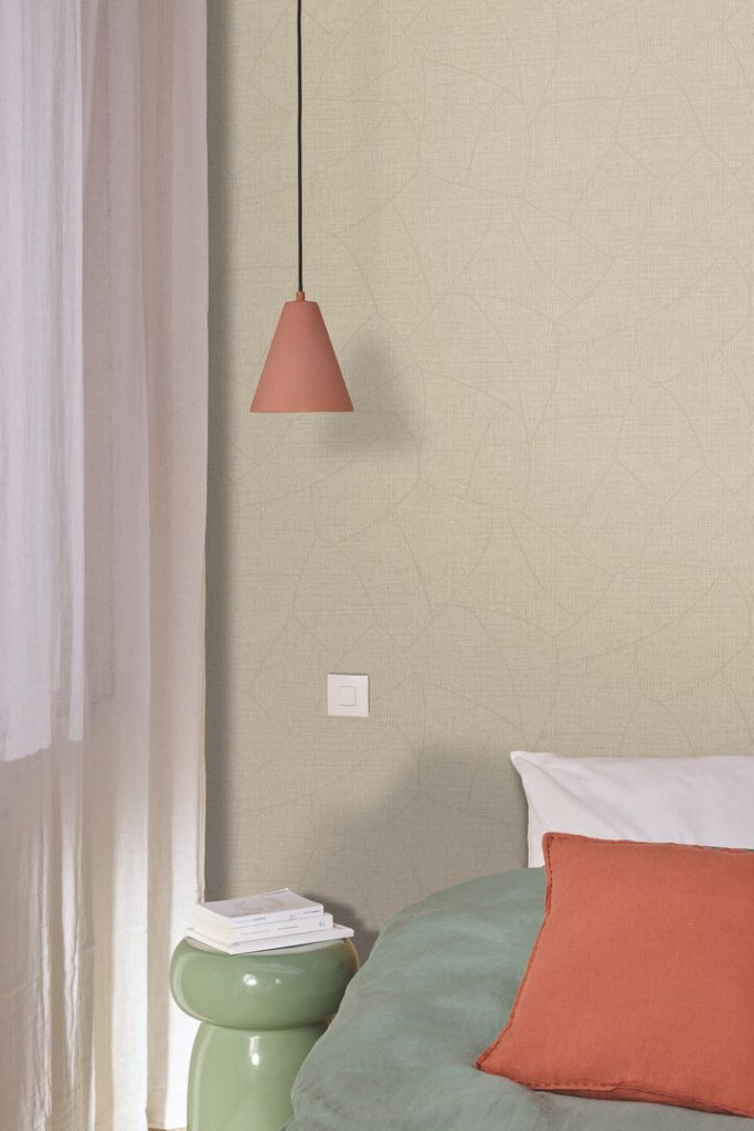 a térbe. Alapszíne törtfehér és bézs, melyet finom szalmaszínű grafikus ívek gazdagítanak