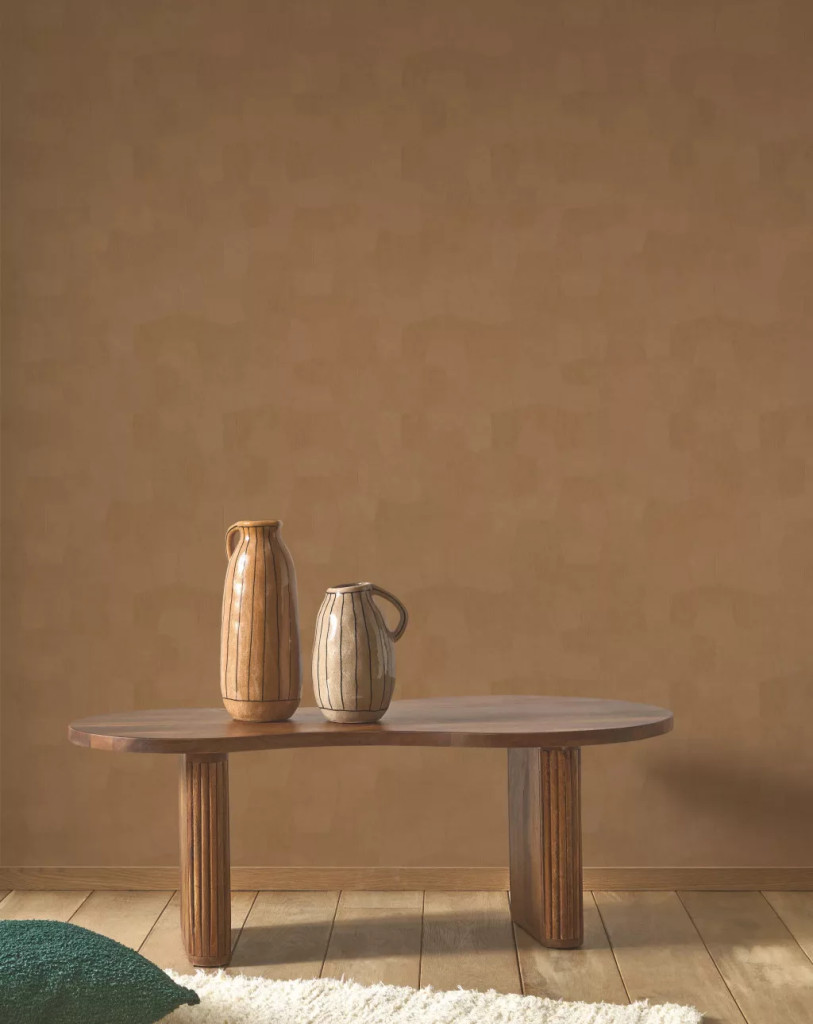 Nappali és étkező terekben különösen hatásos, természetes fa bútorokkal és meleg földtónusú