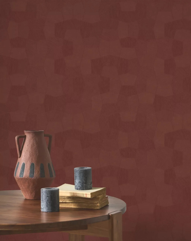 Holdtájak ihlette geometriai mintázat - szabálytalan alakzatok különböző irányú vonalak vörös/bordó/vörösesbarna tónus tapéta