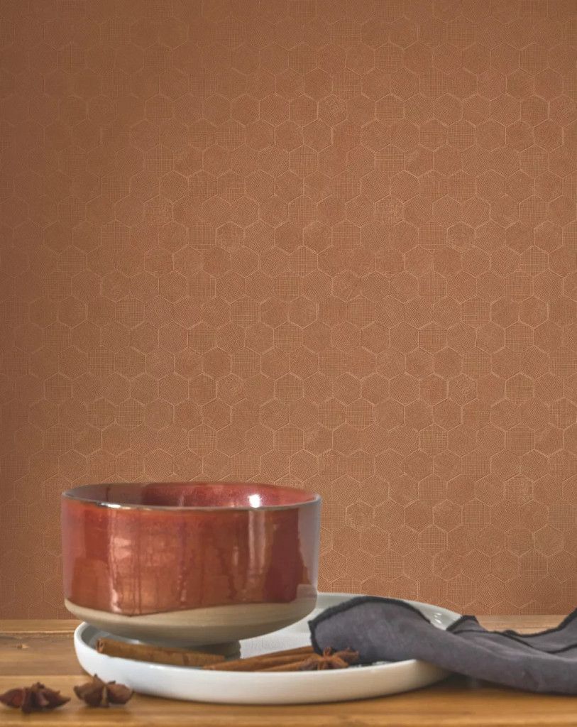 Méhsejtek geometriai tökéletessége - szabályos hatszögek fémes irizáló mintája terrakotta/rozsdavörös/fahéjbarna tónus tapéta