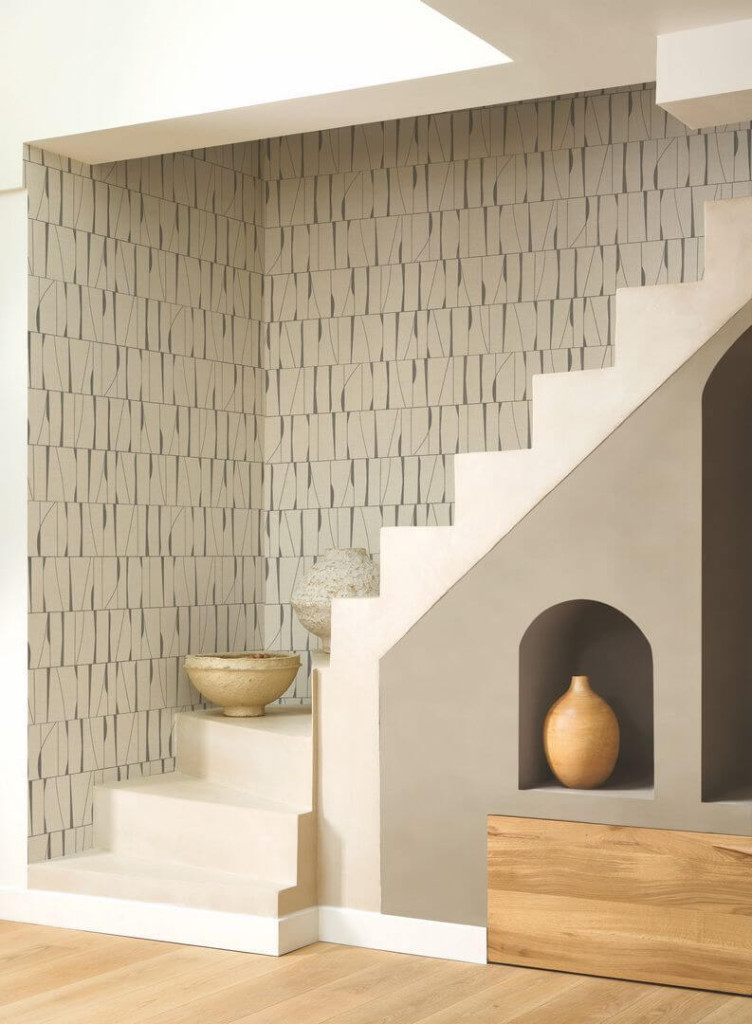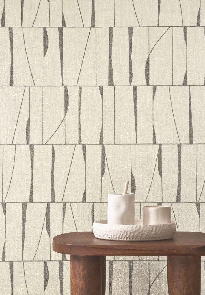 Bézs alapon futó szénszürke ívek kontrollált káoszt teremtenek - mintha egy elfeledett