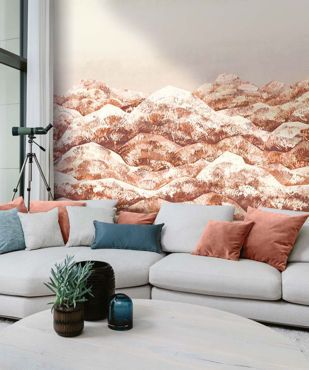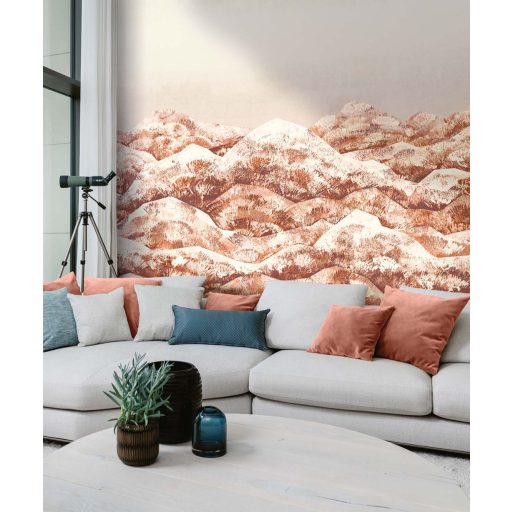 Ez a falfestmény lenyűgöző tájat ábrázol, tele korallvörös, rózsaszín és krémszínű árnyalatokkal