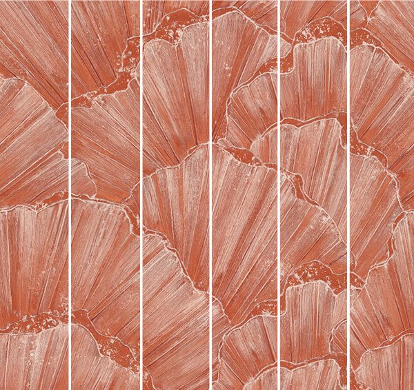 vibráló korallvörös és krémszínű árnyalatokkal, némi rózsaszín ragyogással. Ez a posztertapéta