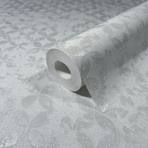Stilizált levelek strukturált koptatott felületen grafikai minta szürkésfehér világosszürke és ezüst fémes hatás tapéta