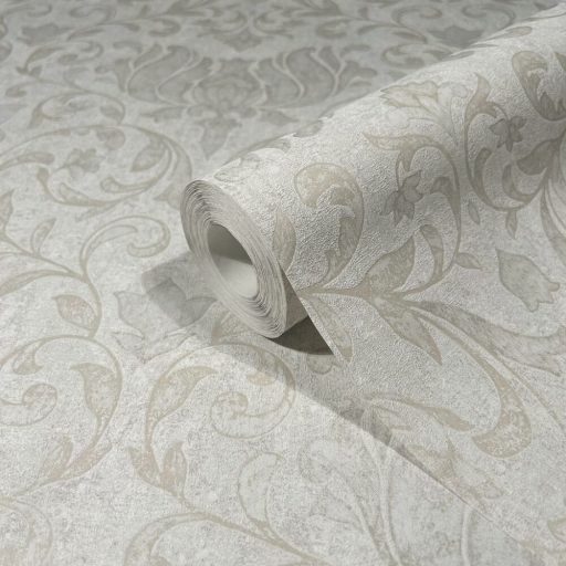 Damaszt hatású klasszikus szépségű és mintázatú Vintage dekorminta szürkésfehér szürke és bézs tónus tapéta