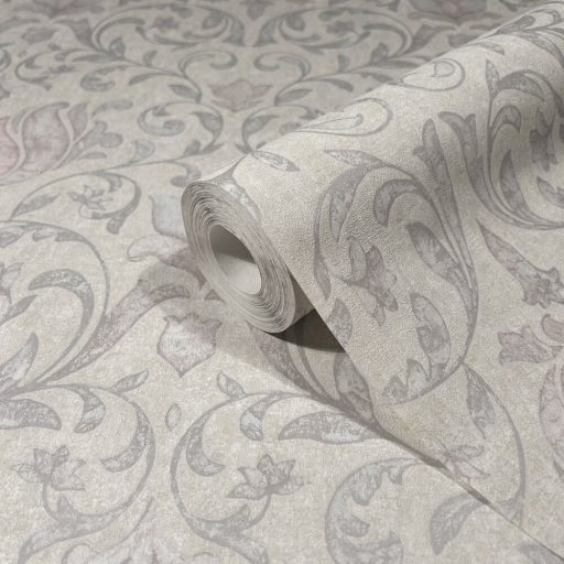 Damaszt hatású klasszikus szépségű és mintázatú Vintage dekorminta törtfehér bézs szürke és rózsaszín tónus tapéta