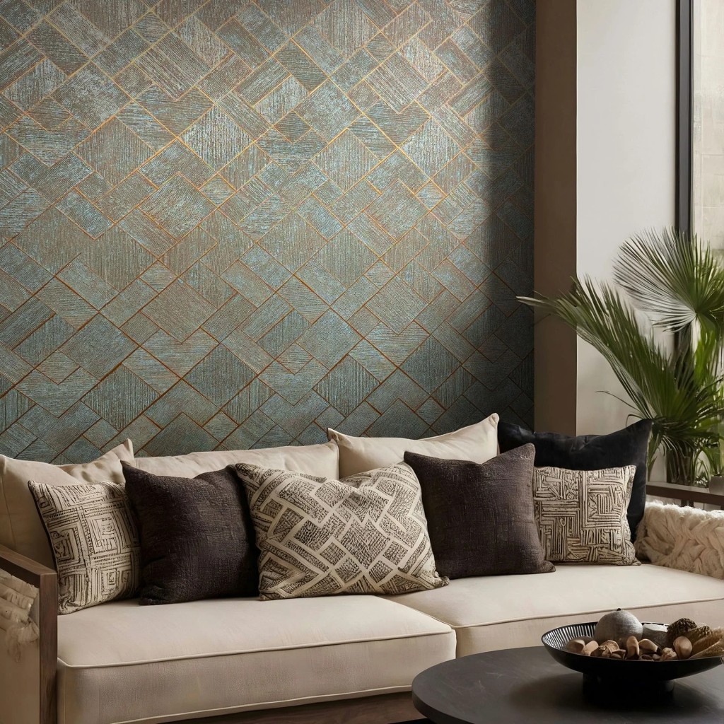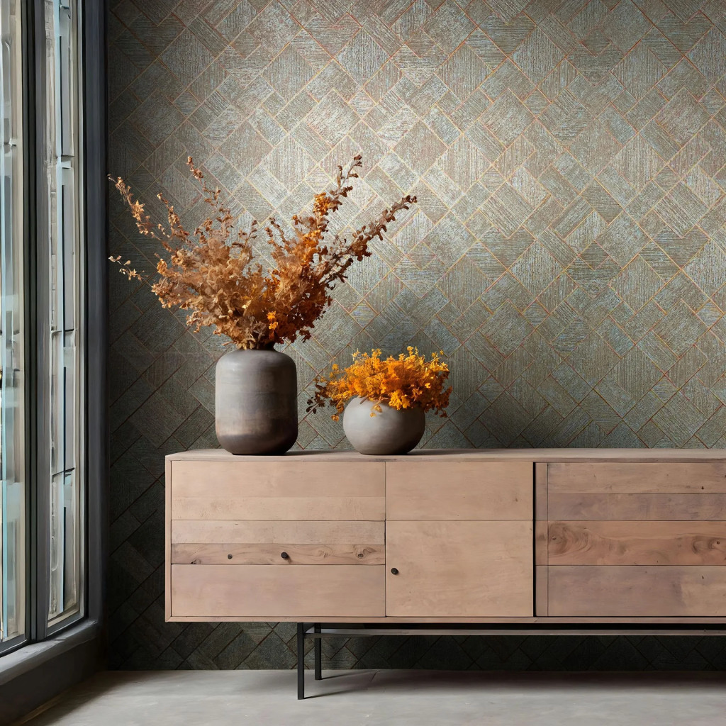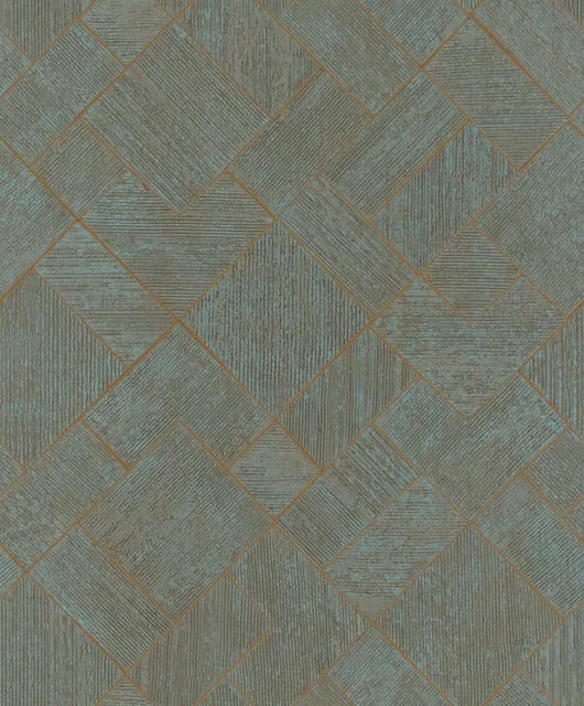 Változatos geometriai minta a textúrák és a fény játékával óceánzöld barnászöld arany/aranybarna és tónus finom mintafény tapéta