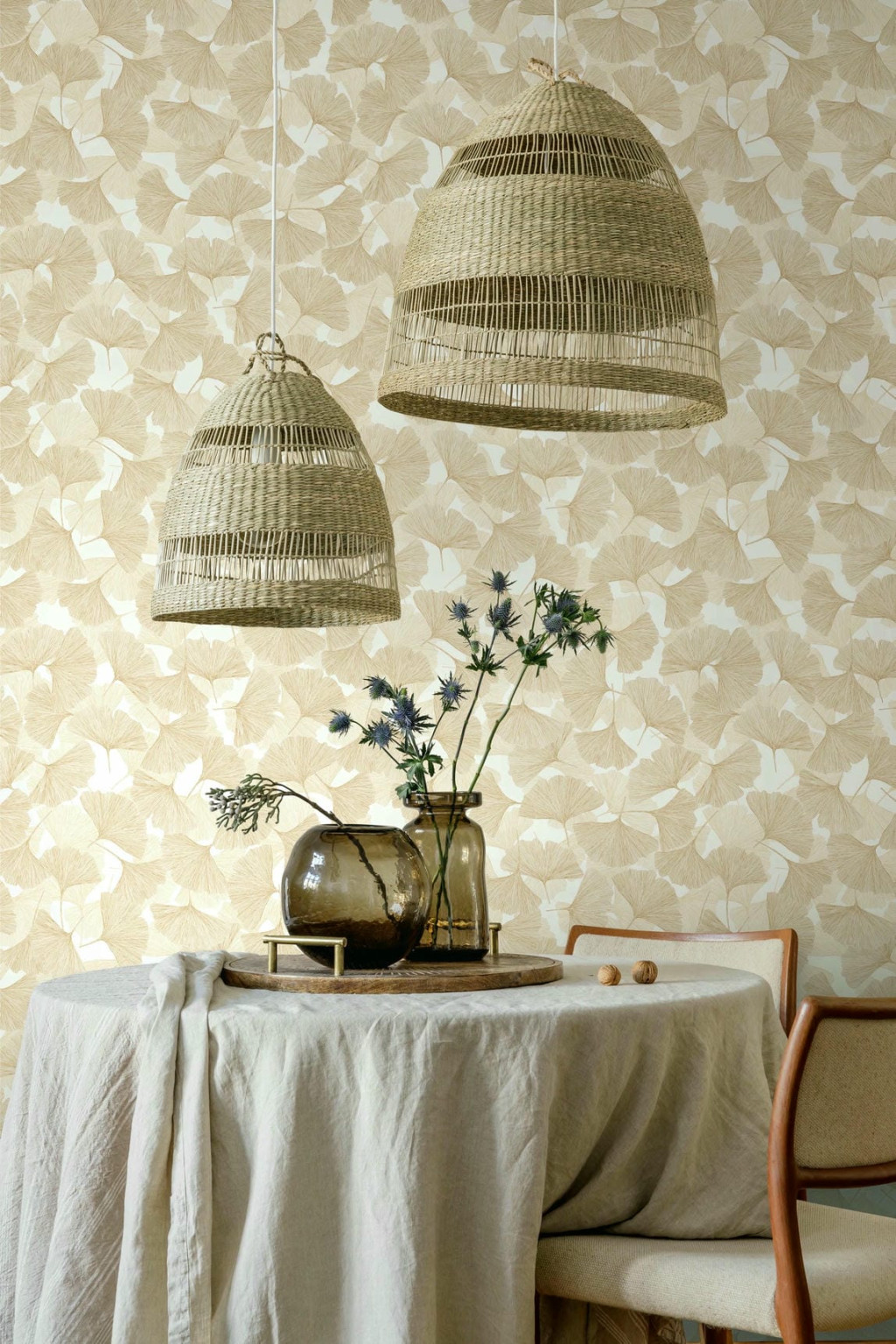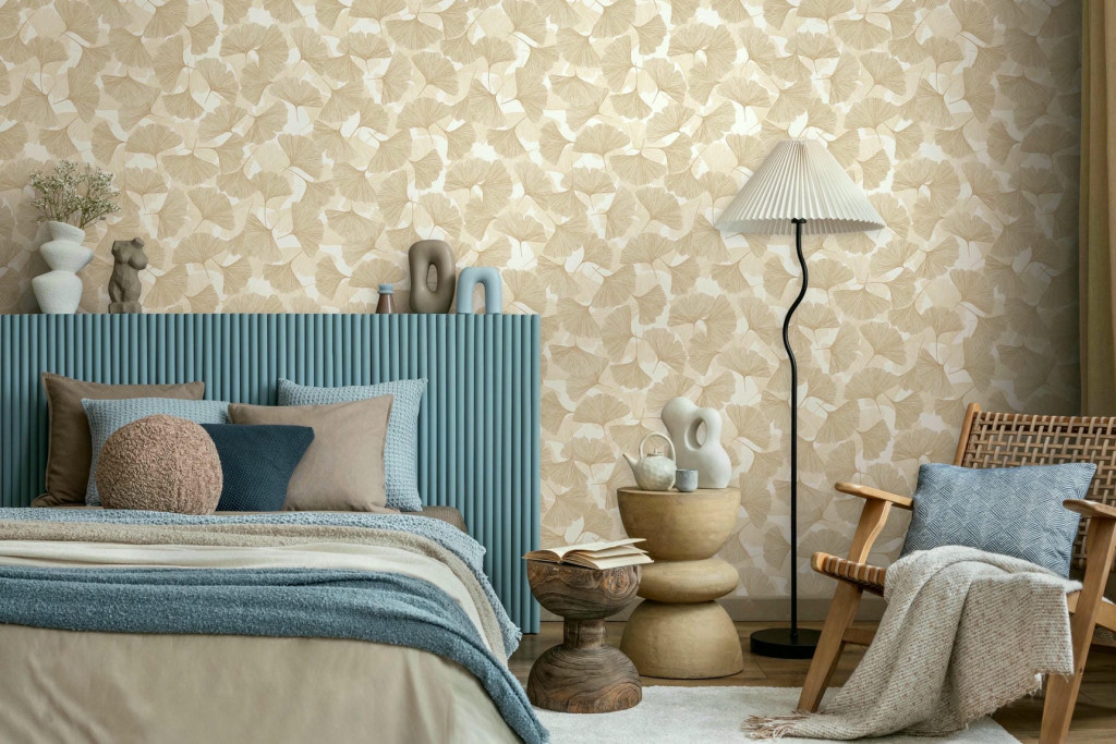 Tipp : Meleg bézs ginkgo-ölelés - a levelek aranylóan simulnak a falra, mintha napsütötte
