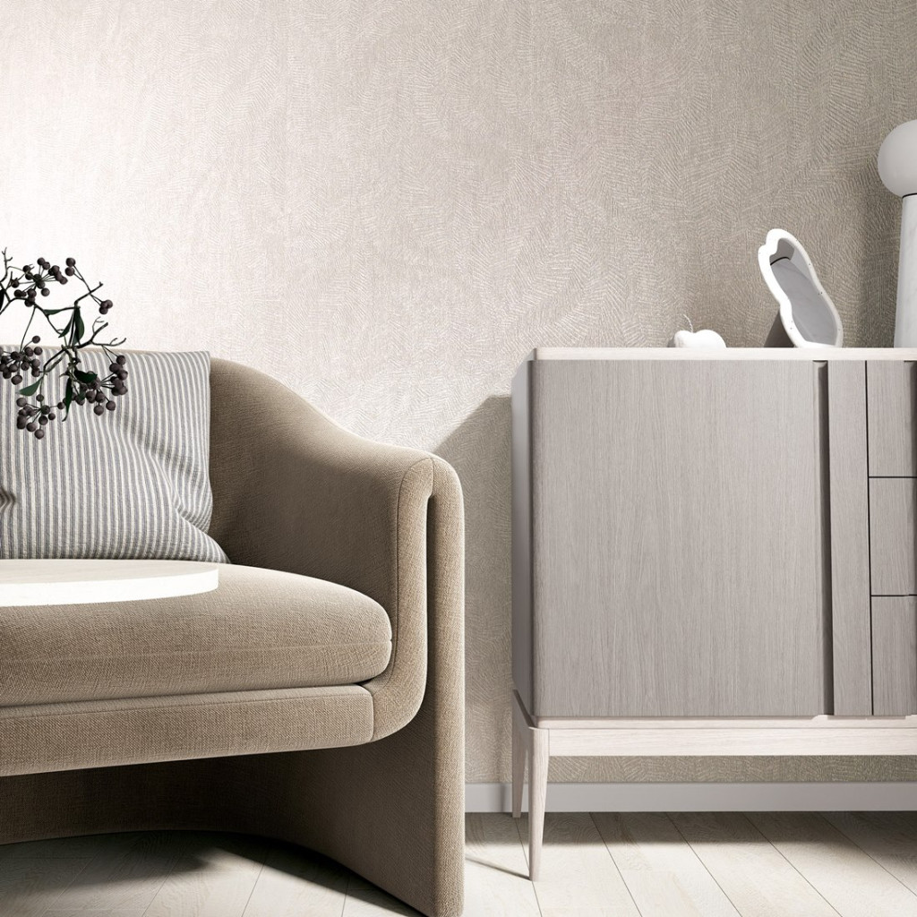 bútorokkal és homokszínű buklékanapéval - a három anyag együtt olyan harmóniát alkot