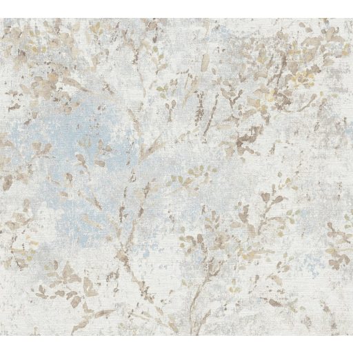 Karcsú ágakon akvarell megjelenésű virágok levelek koptatott háttéren bézs szürkésbézs fehér szürke és kék tónus tapéta