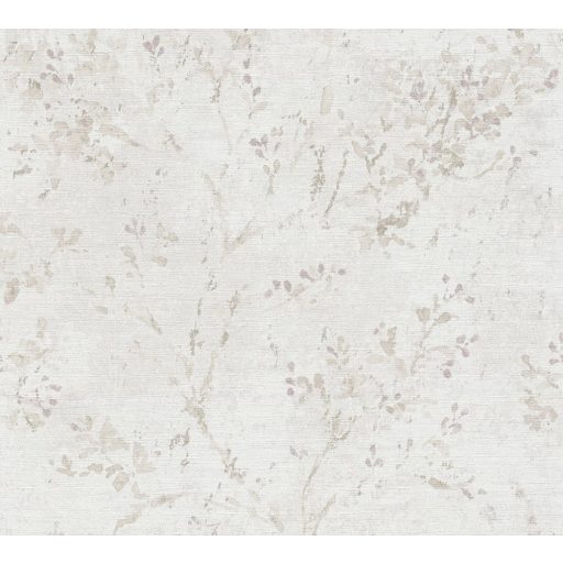 Karcsú ágakon akvarell megjelenésű virágok levelek koptatott háttéren szürke bézs törtfehér és világosbarna tónus fémes hatás tapéta