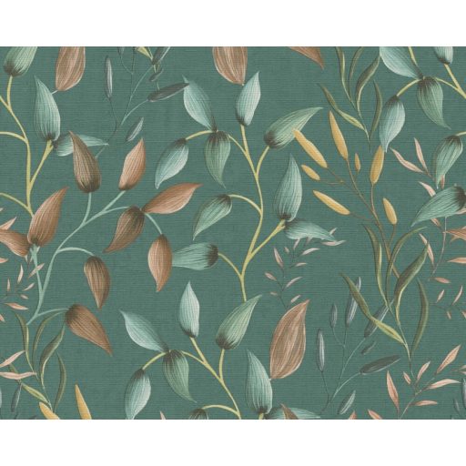 Akvarell hatású bájos virágok levelek finom rajzolatú indákon petrolzöld barna sárga és rózsaszín tónus tapéta