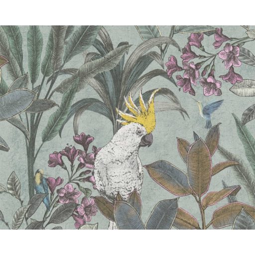 Trópusi virág és levélmotívum békés kakadukkal Shabby megjelenésben világoszöld barna lila zöld fehér és sárga tónus tapéta