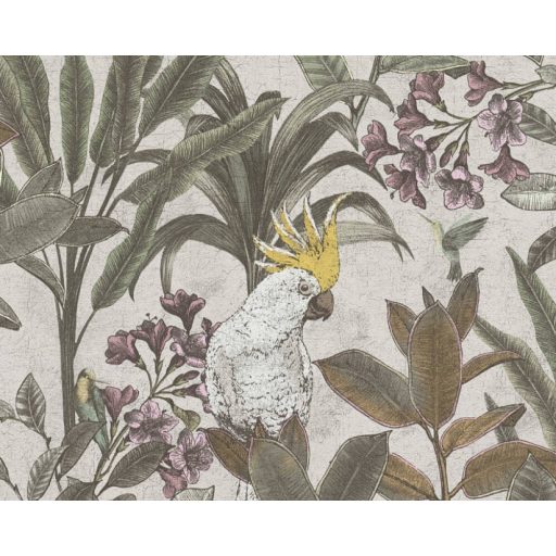 Trópusi virág és levélmotívum békés kakadukkal Shabby megjelenésben krémszürke zöld lila barna fehér és sárga tónus tapéta