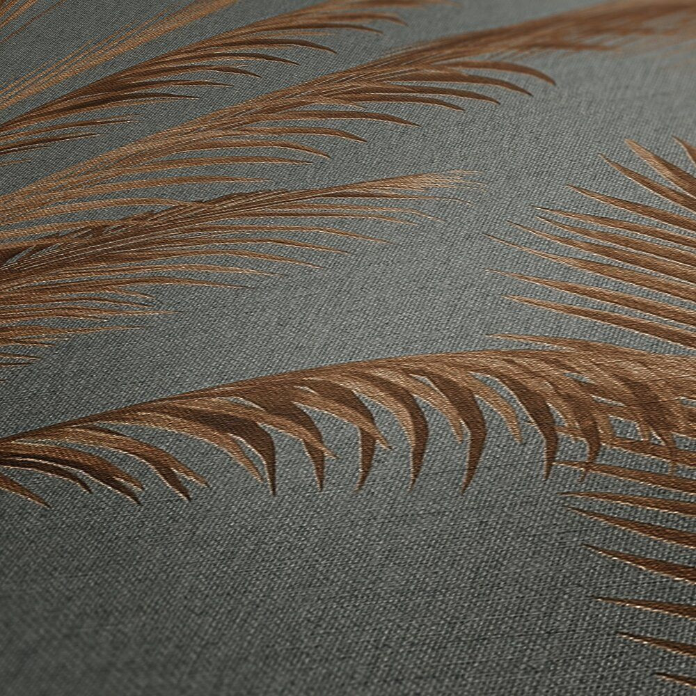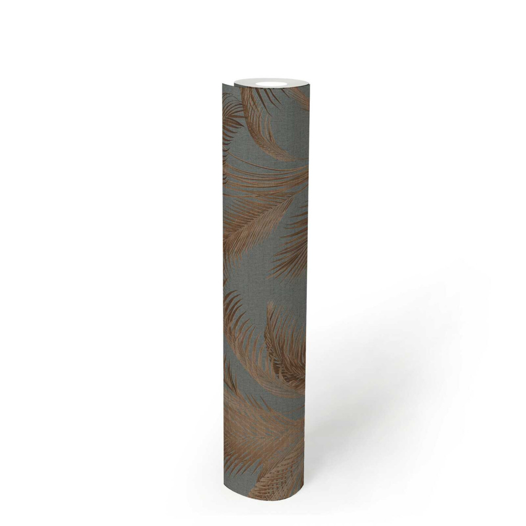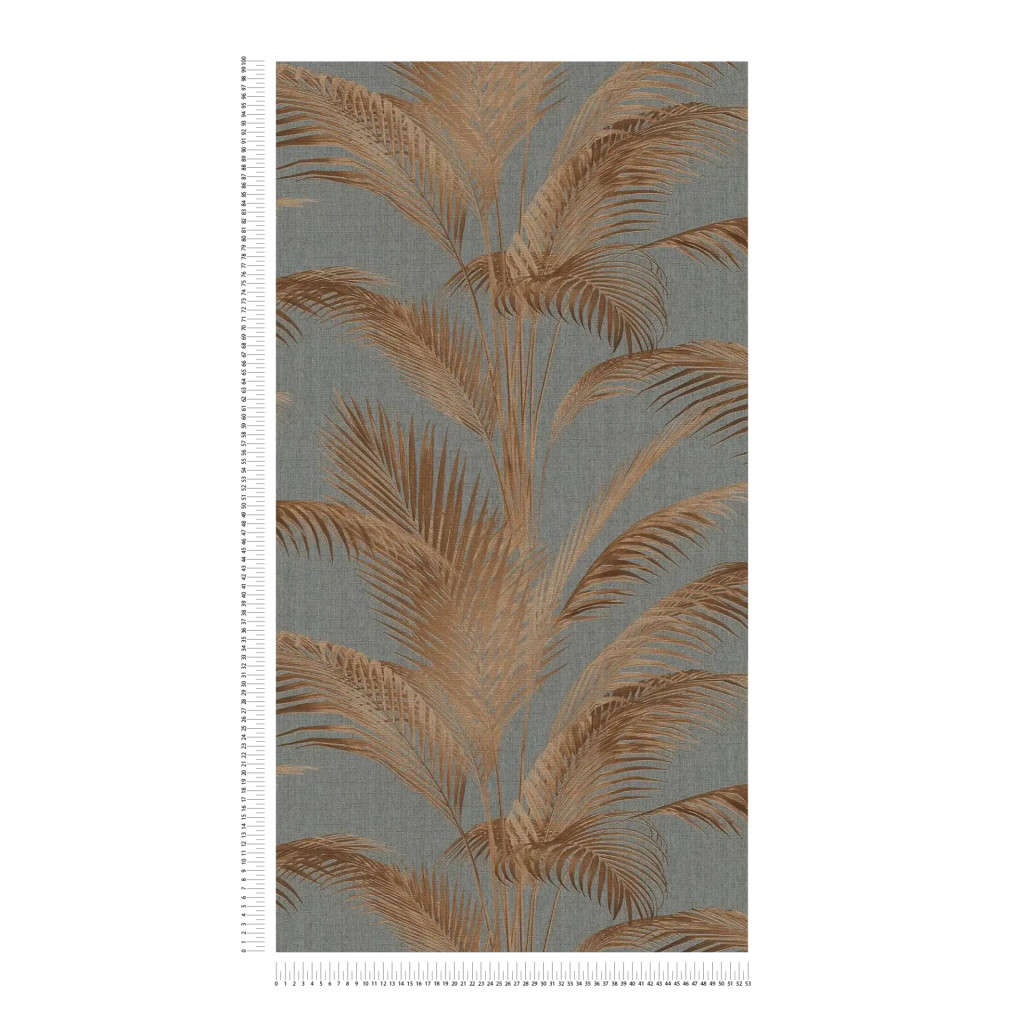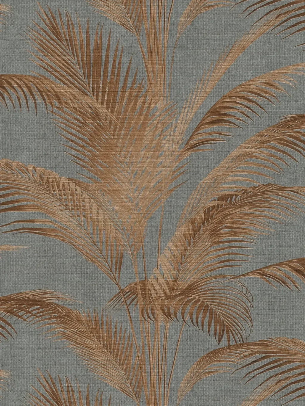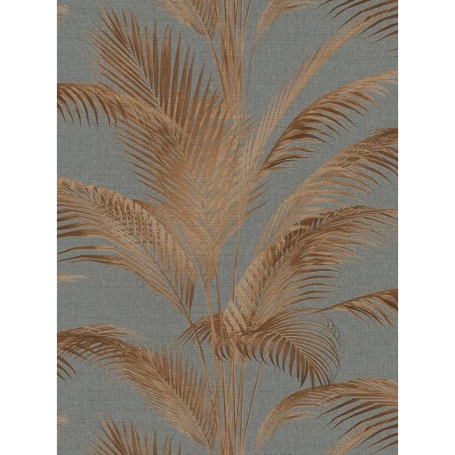 Harmonikus és elegáns vintage pálmalevél kompozíció szürke rozsdaszín és fémes arany tónus finom mintafény tapéta