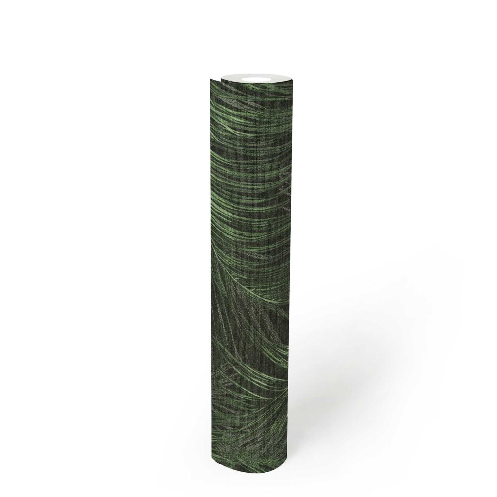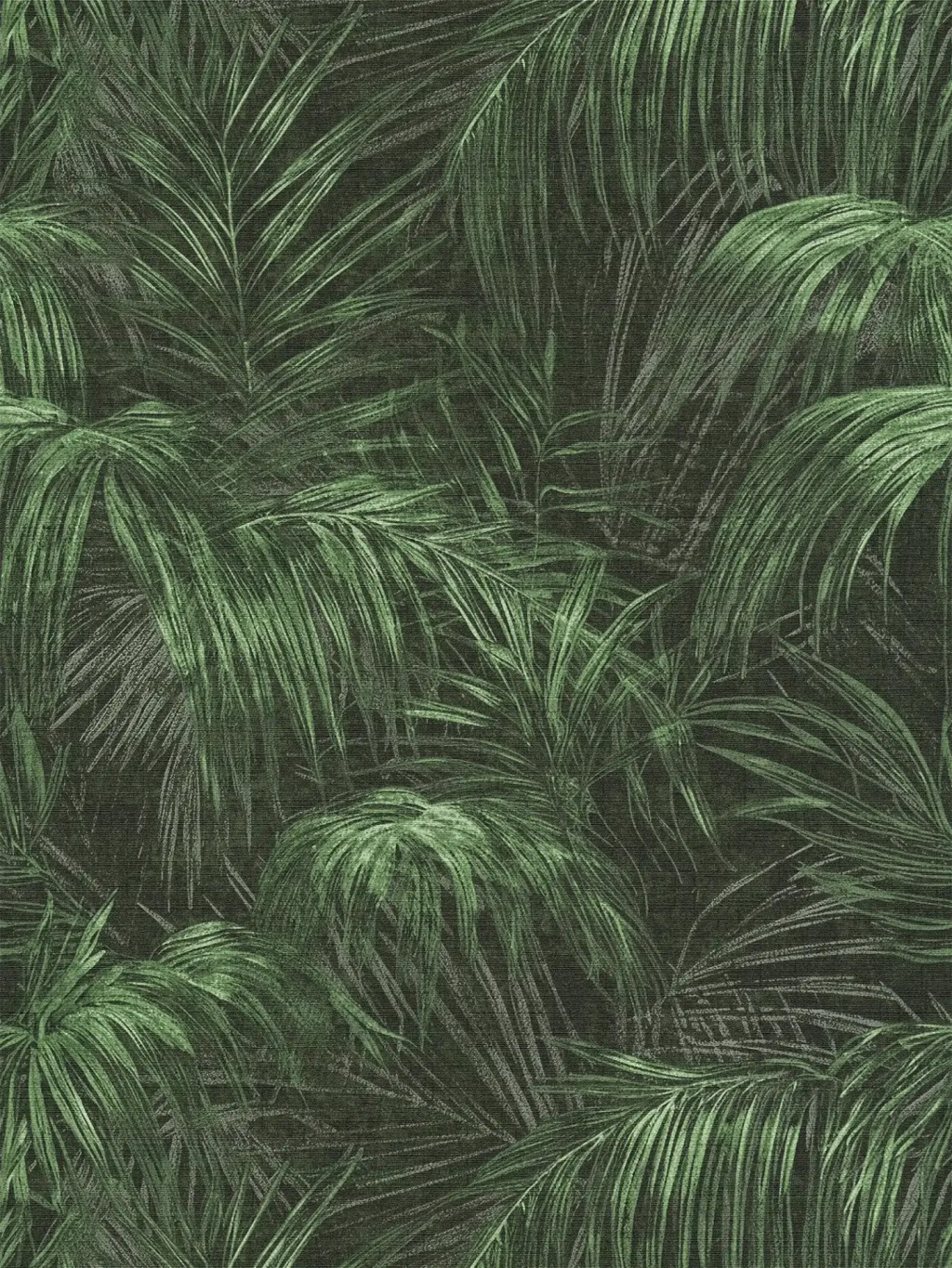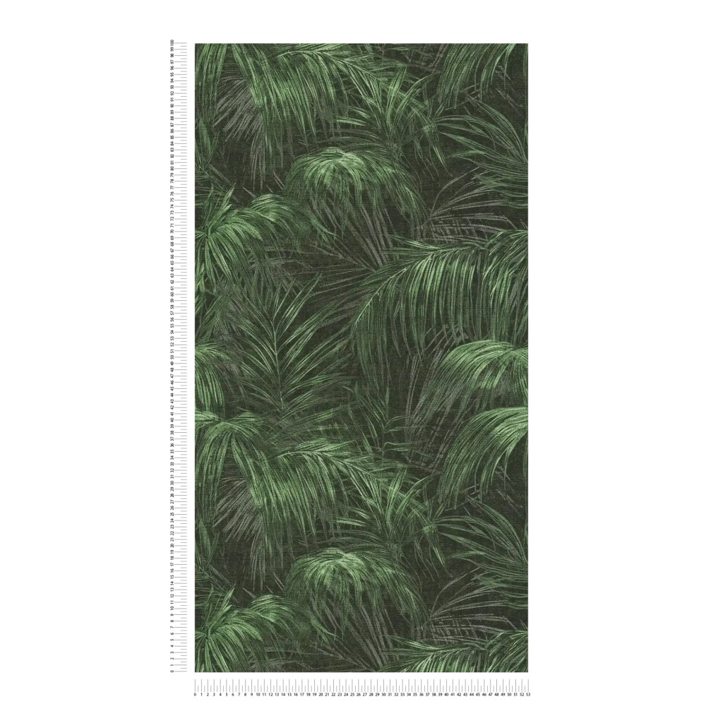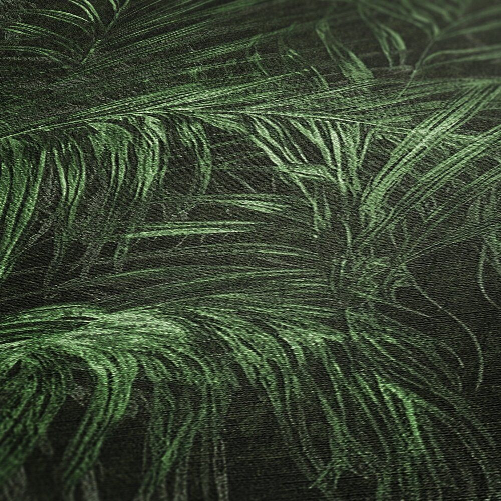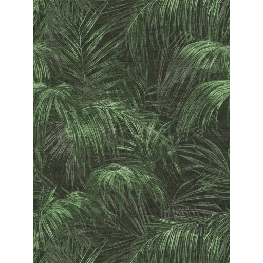 Pazar térbeli elhelyezkedésű vintage pálmalevél kompozíció fekete szürke és zöld tónus finom mintafény tapéta
