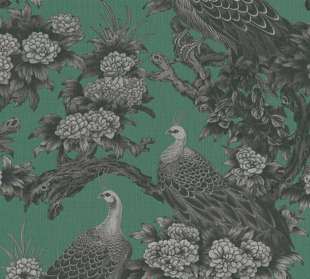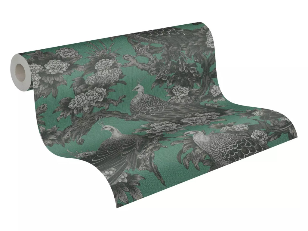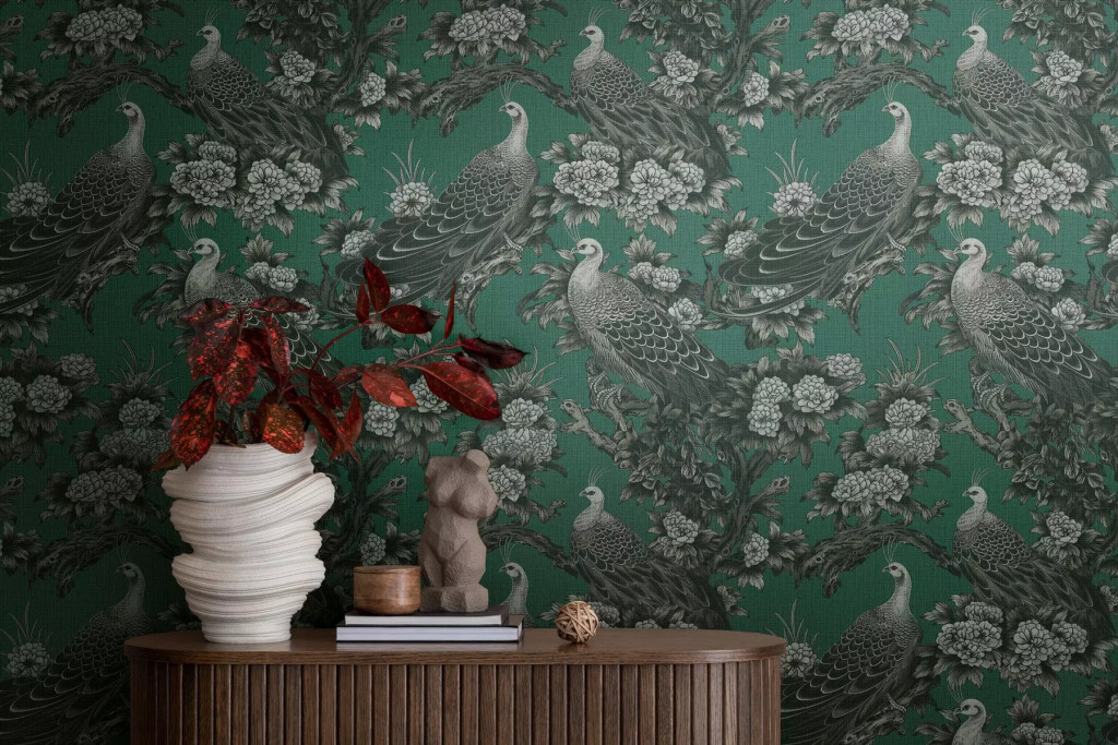 Tipp : A tapéta egy elegáns klasszikus ázsiai ihletésű mintázatú. A minta pávákból