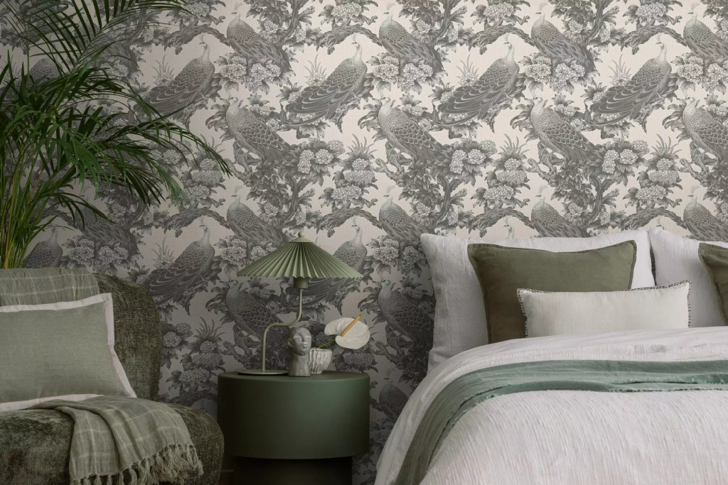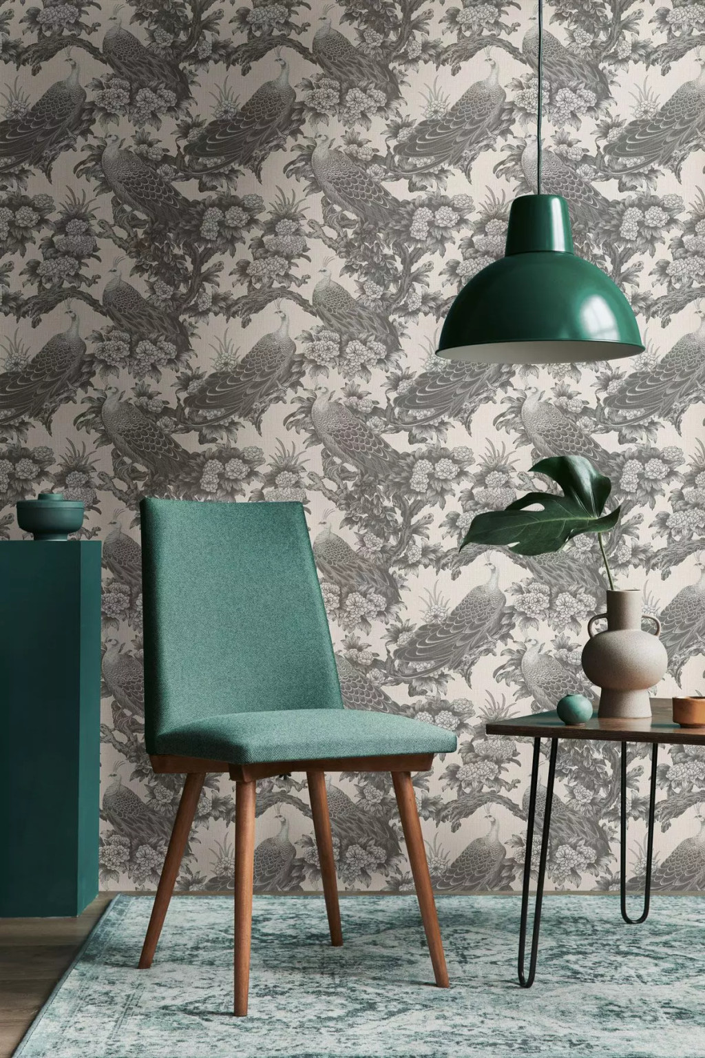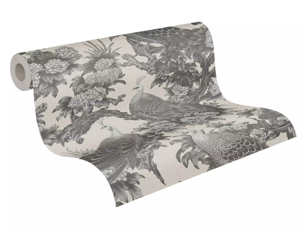 Tipp : A tapéta egy elegáns klasszikus ázsiai ihletésű mintázatú. A minta pávákból