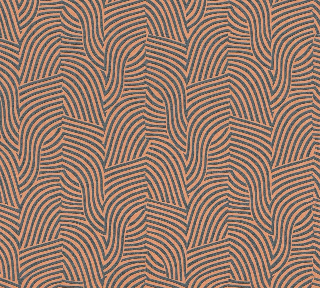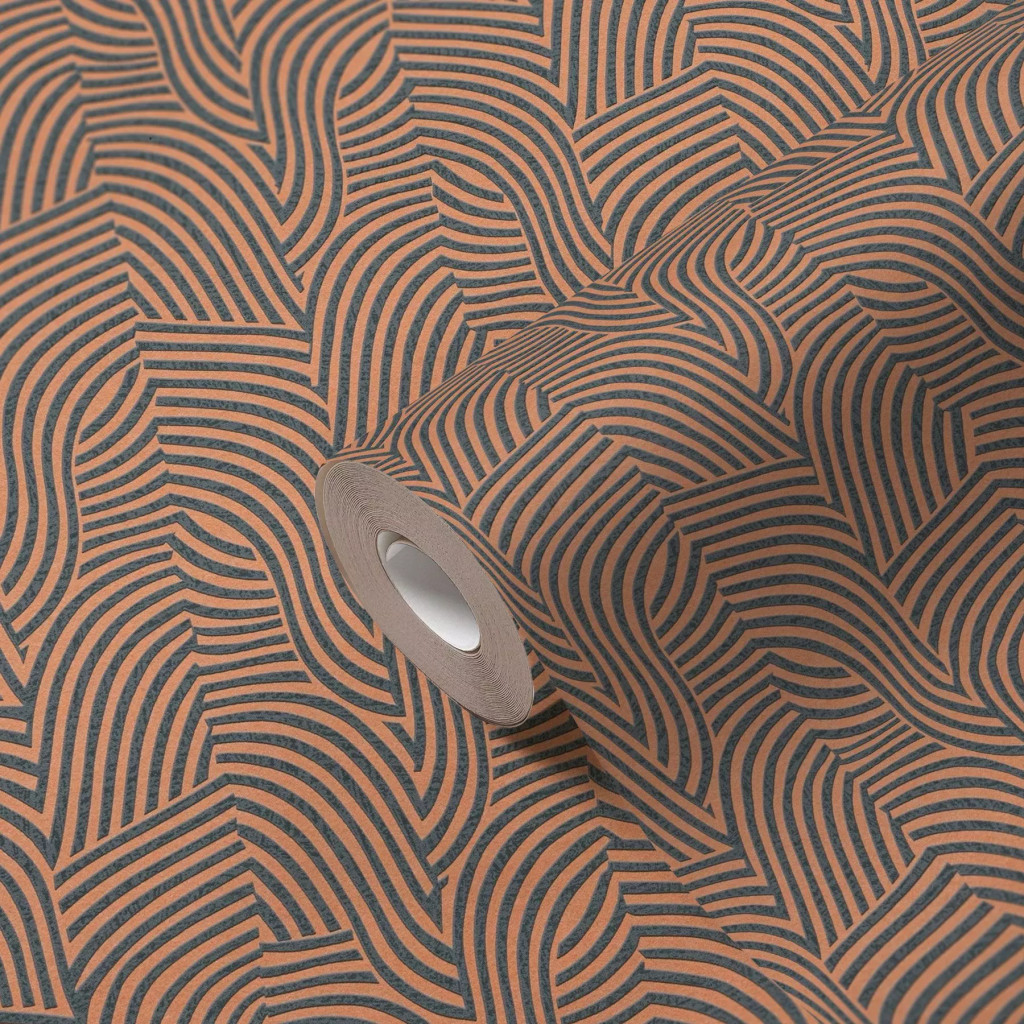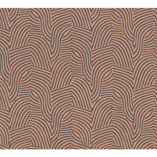 Íves hullámos vonalak alkotta art deco ihletésű minta narancs/terrakotta és antracit tónus finom fény tapéta
