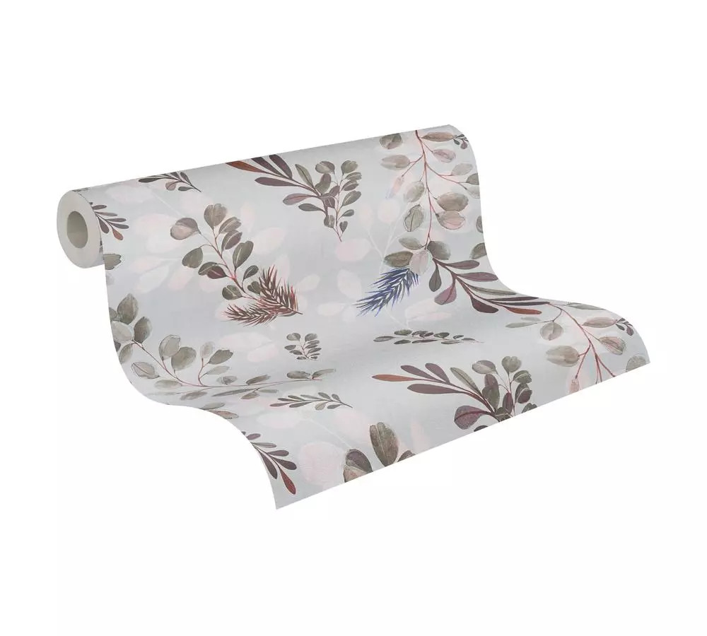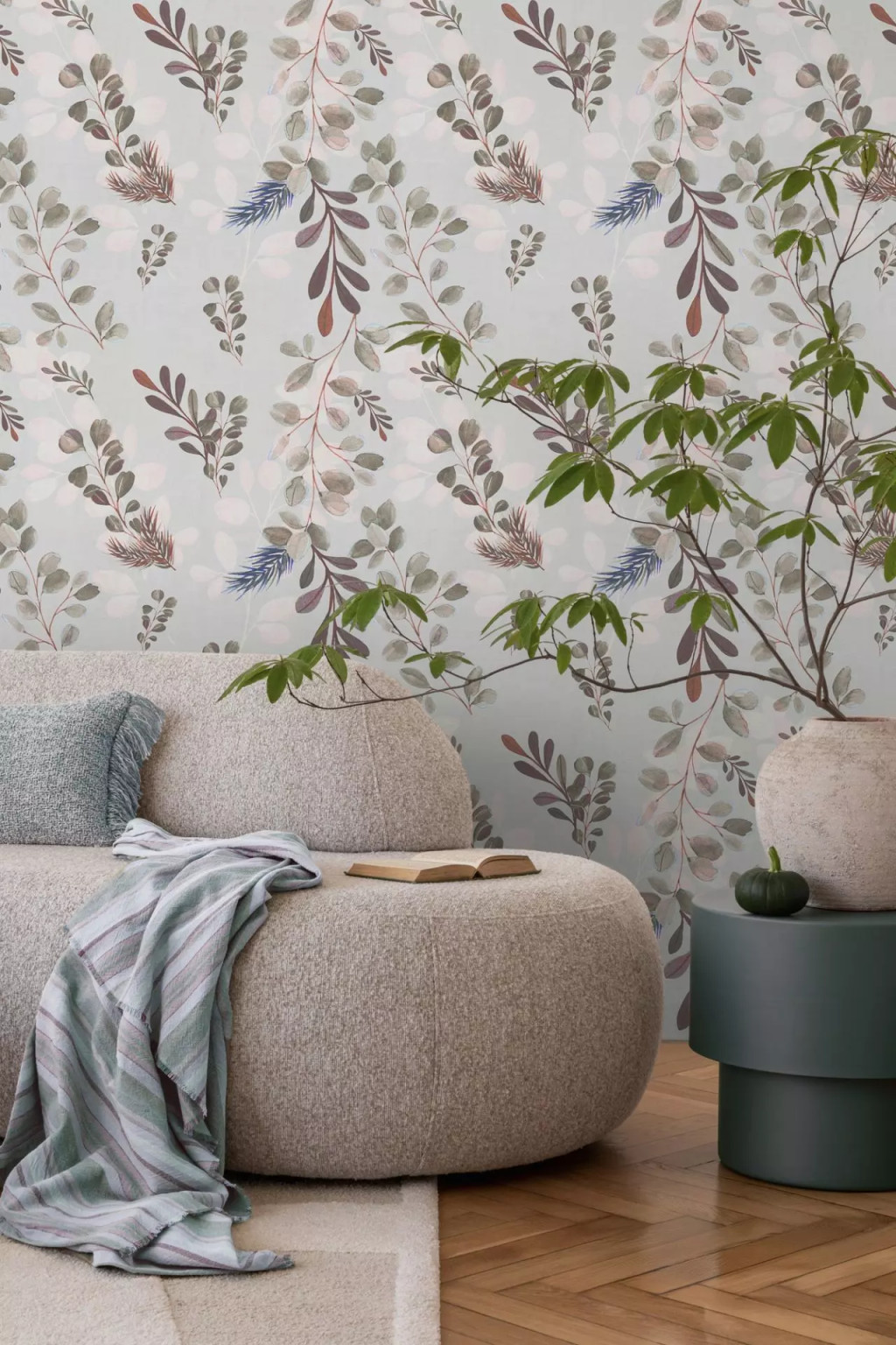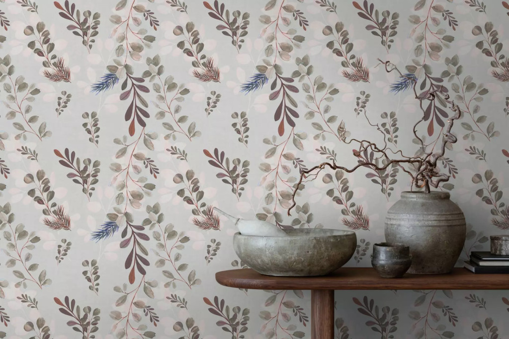 Tipp : A tapéta finom pasztell színvilága, ahol szürkés-rózsaszín alapon barna és kék