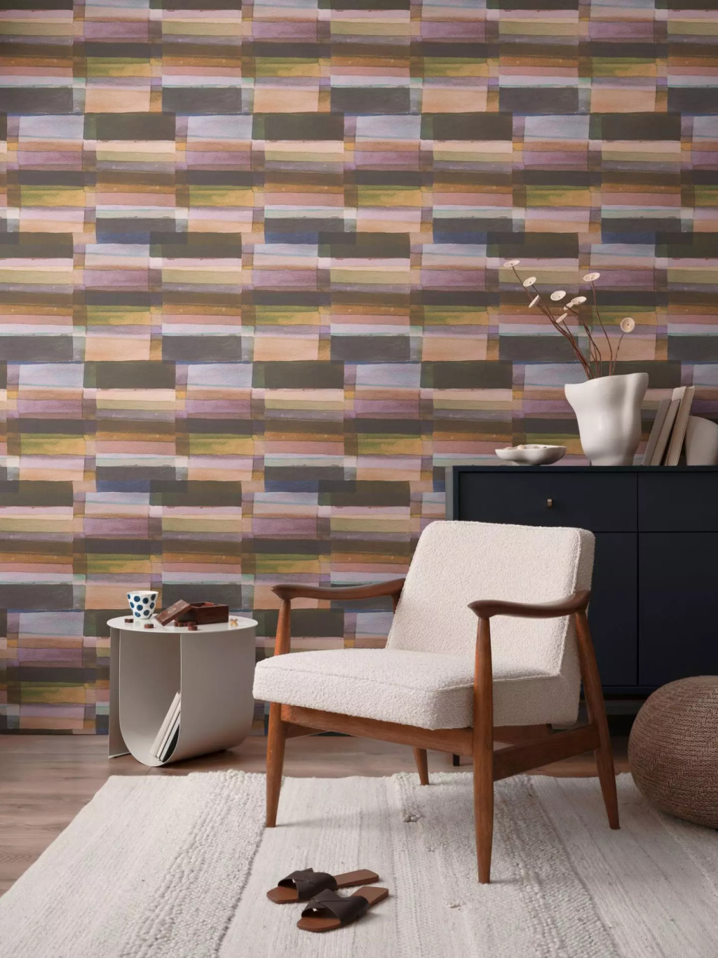 A tapéta kiválóan alkalmas modern, művészi hangulatú nappali vagy dolgozószoba falának