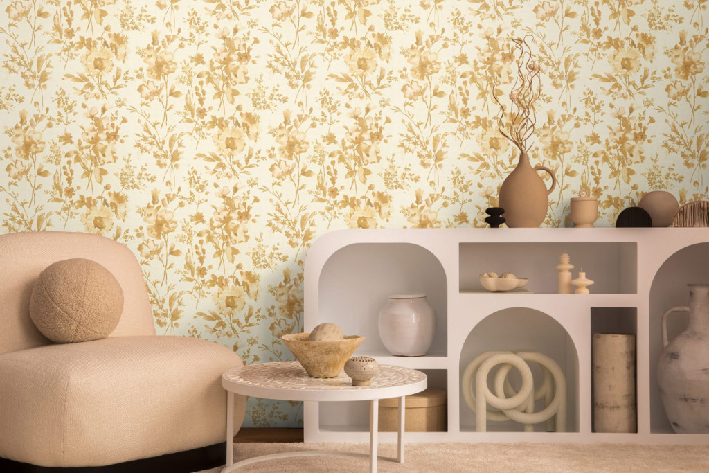 Tipp : Az arany virágmintás tapéta krémfehér alapon olyan, mint egy napsütötte